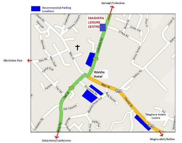 Some parking is available at Maghera Leisure Centre, but is limited, so please view the parking locations map on this post for parking areas in Maghera.