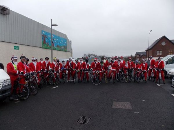 A grand gathering of around 30 Santas (and the odd Christmas Pixie AKA Carl McWilliams) arrived at Maghera Leisure Center this morning for the Annual Santa Cycle, and on their return were treated to warm mulled punch, hot mince pies, and the delicate tone of Fiona & Darren singing christmas songs. :-)