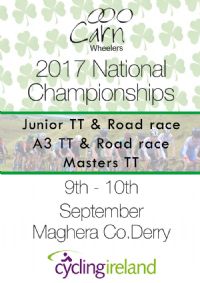 Carn Wheelers are proud to announce that they have been awarded the promotion of the Junior & Master Time Trial and A3 & Junior National Championships to take place on 9th & 10th September 2017. All events for the weekend will be based around the Maghera area with a new course and spectacular finish location for the road races.